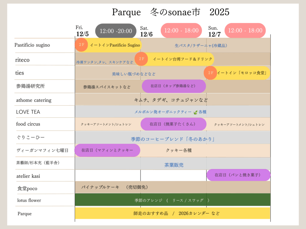 それぞれのご紹介は instagram @parque.event から少しずつお届けいたします。
